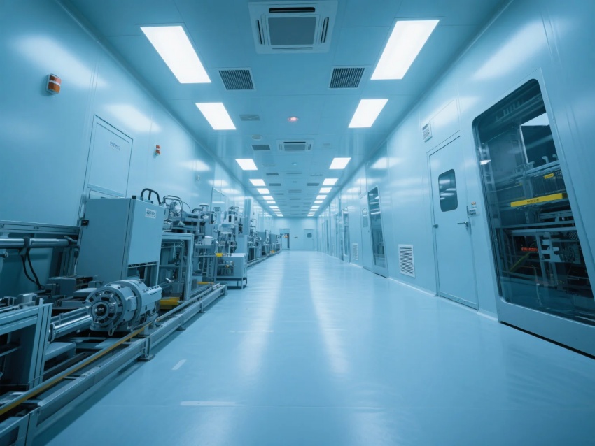 本方案嚴格遵循ISO6級(千級)潔凈標準,采用模塊化潔凈室結構,以灰白色調為主,搭配防靜電高架地板與金屬壁板,打造高精度半導體生產環境。