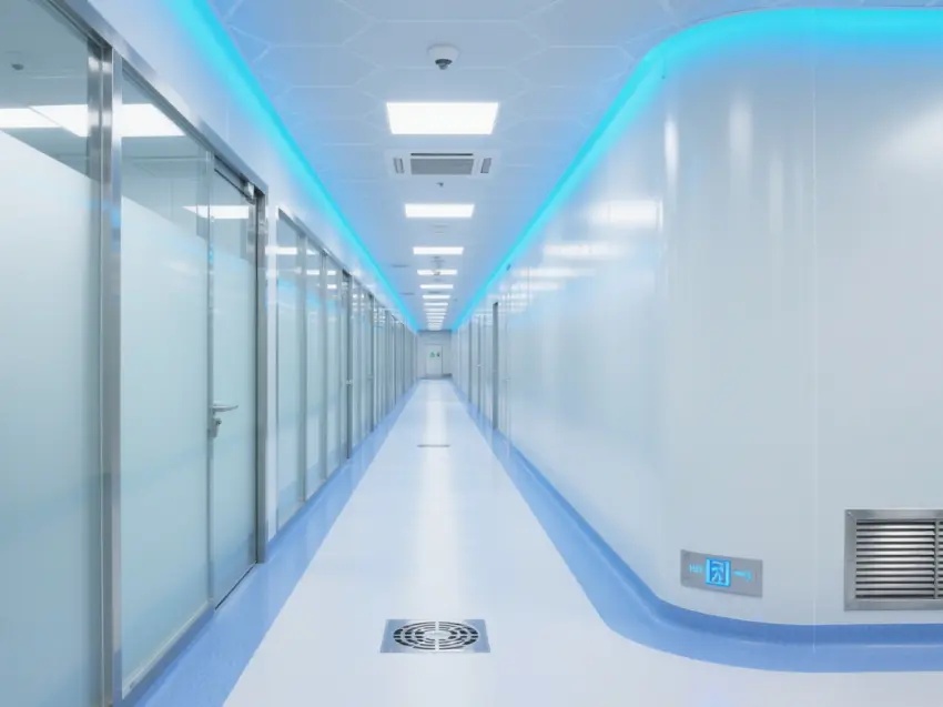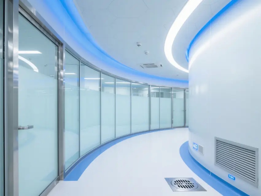 整個(gè)車間以白色為主色調(diào),搭配藍(lán)色的燈光裝飾,營造出一種干凈、專業(yè)且略帶科技感的氛圍。地面和墻面都采用了光滑的材質(zhì),便于清潔和保持衛(wèi)生。