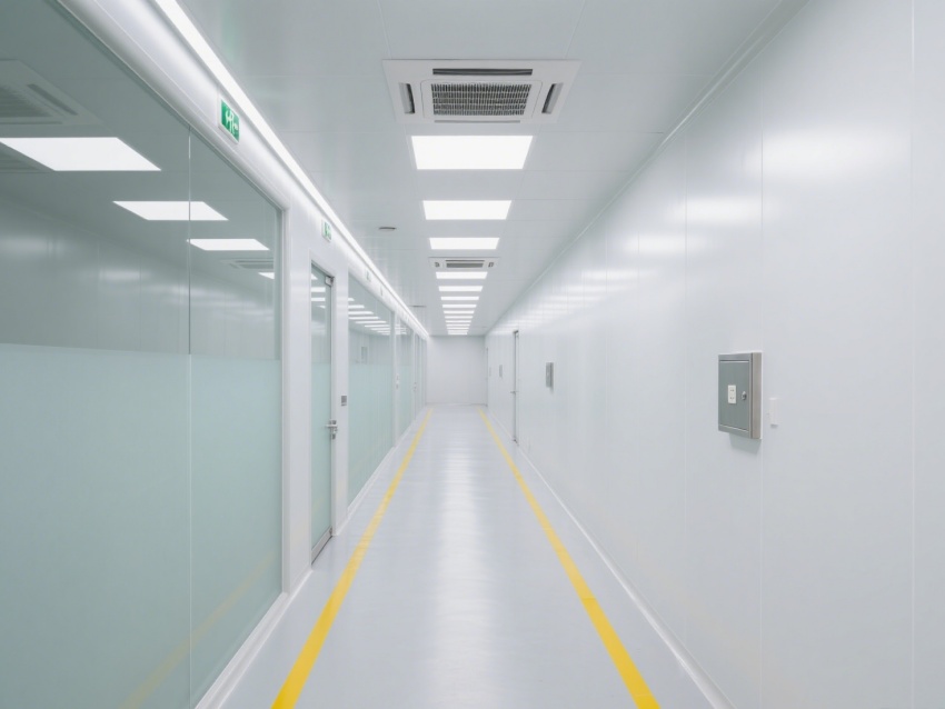 精準還原電子行業潔凈空間,白灰主色調貫穿整體,風格簡約專業且質感統一。淺白墻面搭配淺灰地面、金屬色設備接口線條,既符合電子車間低塵、抗靜電的核心需求,又通過色調層次避免空間單調,視覺上凸顯潔凈通透的特質。?
