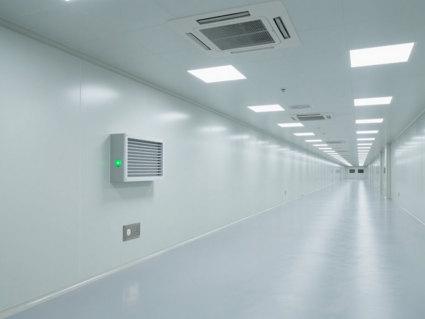 效果圖從多視角展現關鍵設計:正面全景圖呈現開闊無設備空間,預留充足布局靈活性;角落特寫聚焦墻面與地面無縫拼接工藝、圓弧收邊處理,規避積塵死角;側視圖清晰展示頂部十萬級高效送風口、回風夾道與壓差計,直觀傳遞潔凈控制核心;局部細節圖則凸顯地面防靜電環氧涂層的細膩質感,契合電子元件生產防護要求。?
