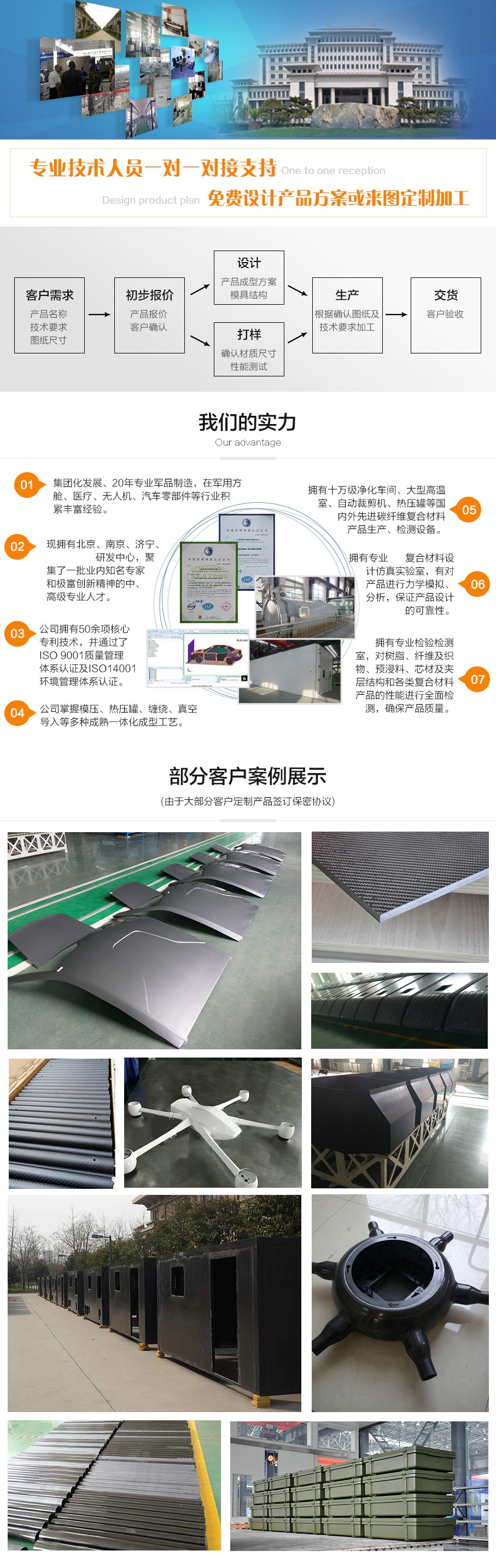 我公司生產的復合材料方艙采用一體化成型工藝設計,方艙采用模具化設計,再生產之前已進行模具設計,方艙各個面都在生產過程中一體成型,不存在拼接面,并且上產之初以預留各種門、窗、線、吊裝空等。并且公司擁有大型高溫固化箱和熱壓罐,保證了產品的成型強度。公司首創的一體化成型工藝在民用市場深受客戶的相信。