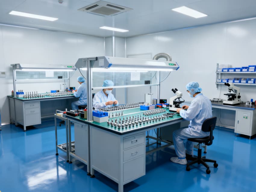 本無菌醫療器械生產廠房整體遵循GMP無菌生產標準,以藍色防靜電潔凈地坪搭配白色抗菌墻面,構建高效凈化體系,適配注射器、植入器械等無菌產品生產。凈化功能貫穿全空間,核心圍繞塵粒控制、微生物抑制及交叉污染防范,為產品質量筑牢第一道防線。