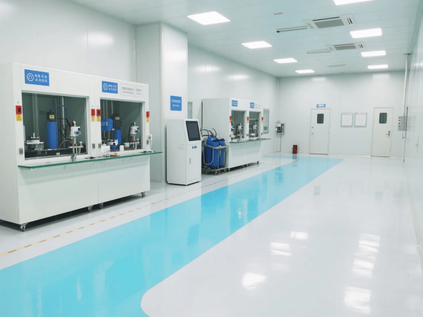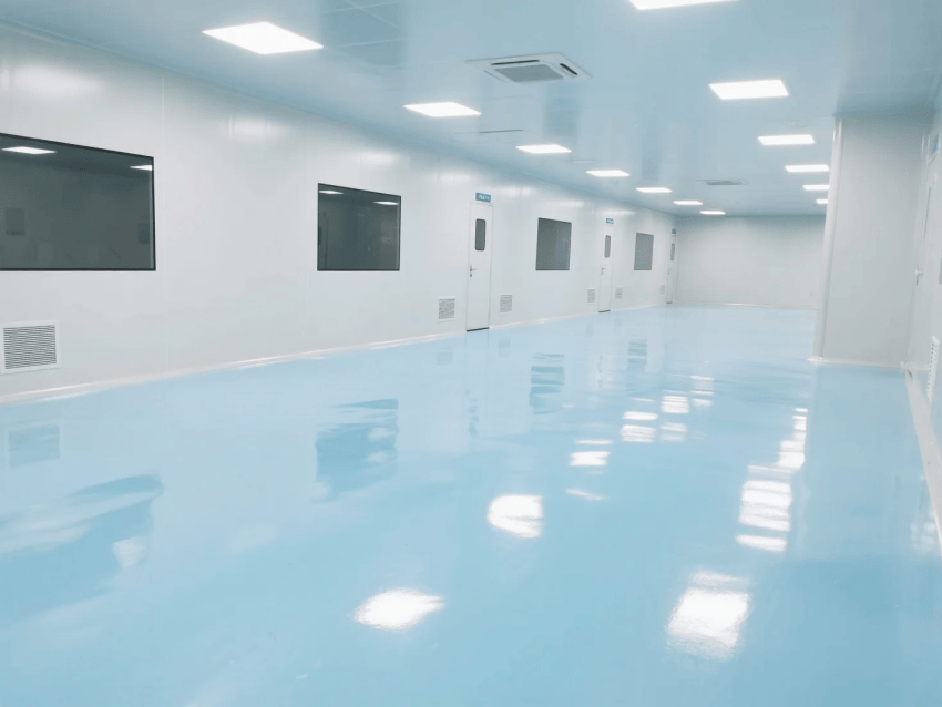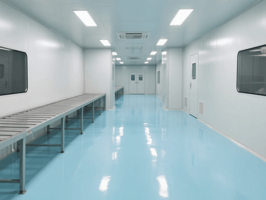 地面系統(tǒng)采用3mm厚環(huán)氧防靜電自流平工藝,表面電阻值穩(wěn)定控制在10^6-10^9Ω,摩擦系數(shù)0.6-0.8,滿足精密電子制造對(duì)地面的特殊要求。吊頂系統(tǒng)采用FFU+HEPA高效過(guò)濾組合,換氣次數(shù)≥25次/h,維持穩(wěn)定的層流狀態(tài)。功能分區(qū)通過(guò)淺藍(lán)色環(huán)氧劃線清晰標(biāo)識(shí),設(shè)備區(qū)采用啞光白不銹鋼包邊處理。