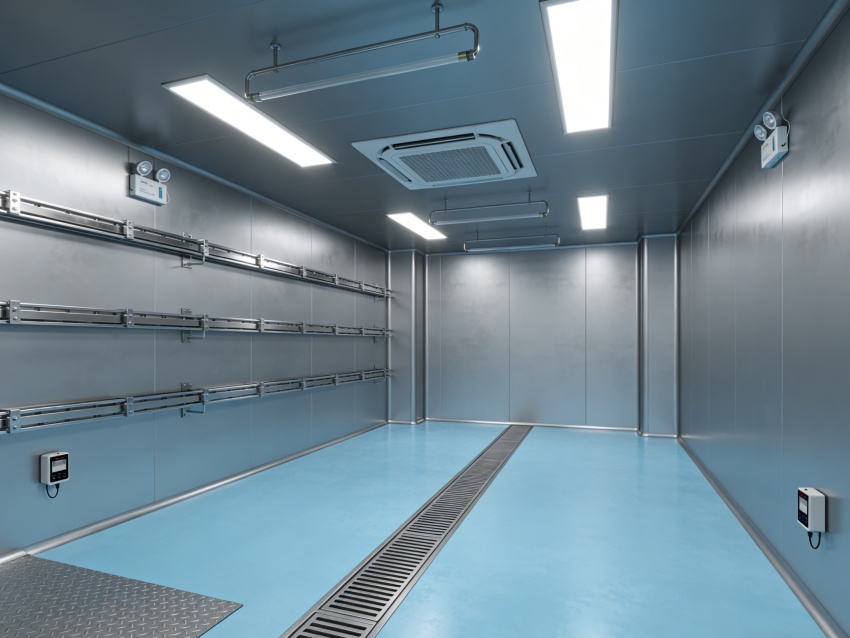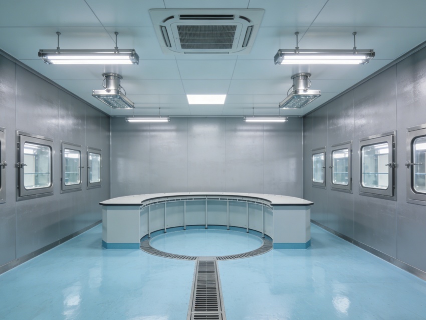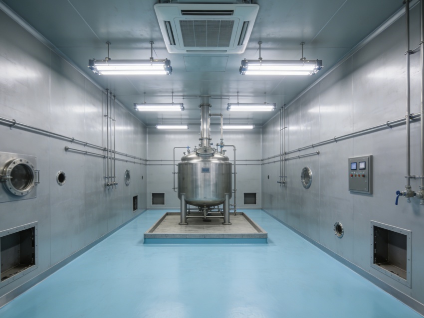 車間內部統一采用淺藍色抗菌防靜電地坪搭配灰色無縫工業級墻面。淺藍色地面選用食品級環氧材質,具備優異的耐腐蝕性與易消殺性能,可耐受各類清潔試劑,同時有效規避靜電干擾;灰色墻面采用抗菌涂層無縫拼接,搭配圓弧墻角設計,徹底杜絕積塵死角,有效降低微生物滋生風險,全面適配無菌環境嚴苛管控需求。