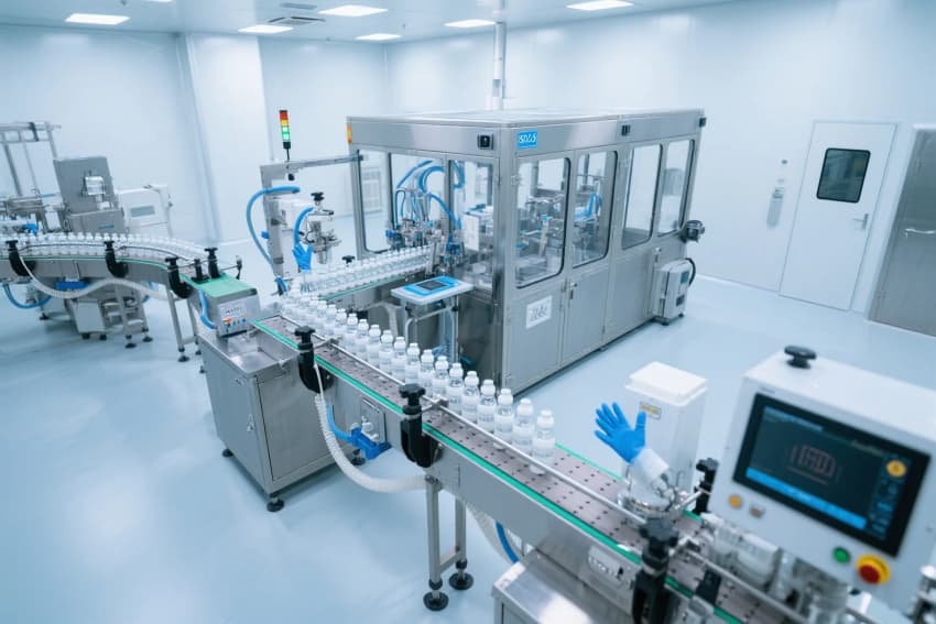 該藥劑生產車間嚴格遵循GMP(藥品生產質量管理規范)標準建設。車間以白色為主色調,搭配藍色標識系統,營造出潔凈、規范的生產環境。墻面、地面采用無縫抗菌材質,便
