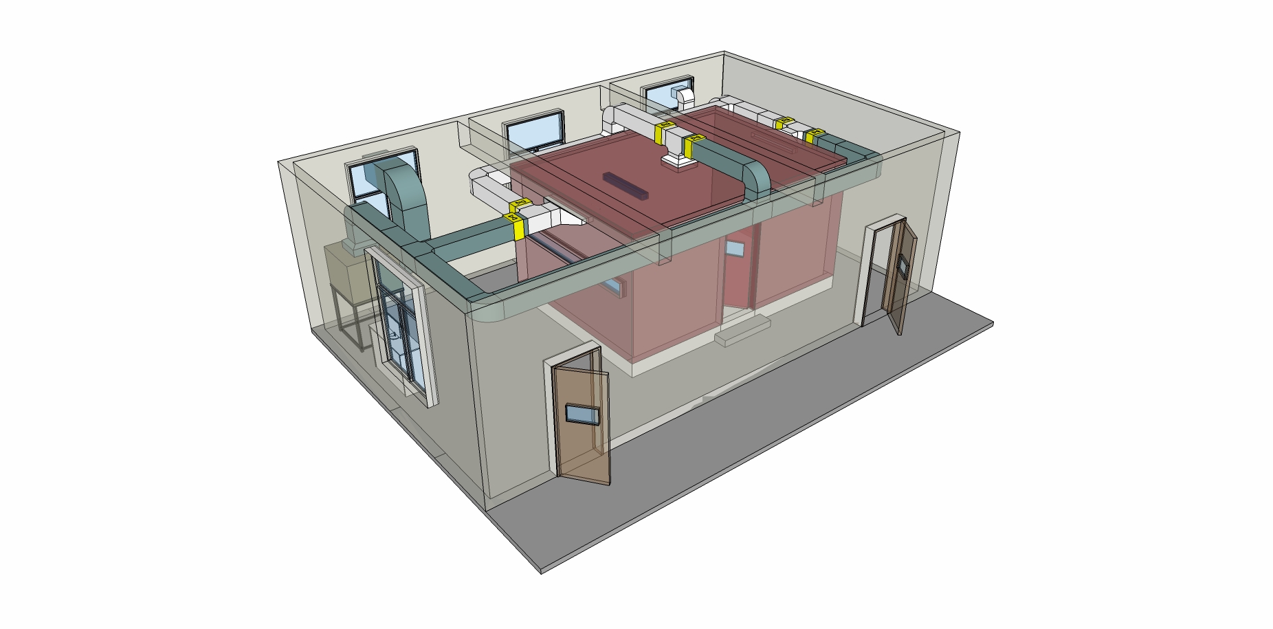實驗室分為外室和內(nèi)室兩部分。內(nèi)室為主要的實驗平臺,放置呼吸暖體假人和VOAG,通過外室的空調系統(tǒng)、恒溫恒濕系統(tǒng)向內(nèi)室送入恒定溫度和濕度均勻的新風,提供恒定的溫濕環(huán)境,整套系統(tǒng)采用全進全排的方式,不回風。外室放置空調機組、恒溫恒濕機柜。