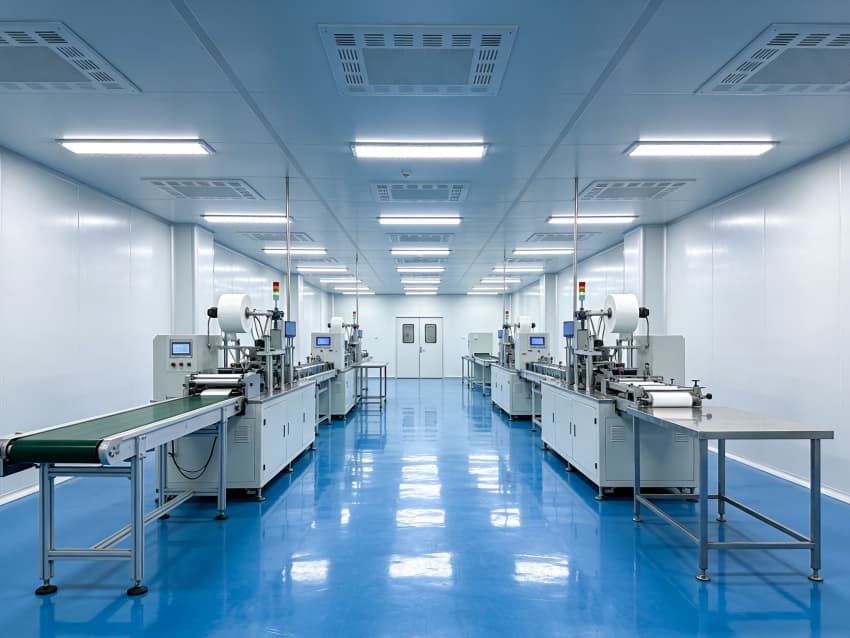 本方案采用"醫療工業極簡風",符合YY/T0969-2013口罩行業標準。車間按功能分區: 原料區(熔噴布恒溫儲存23±2℃) 生產區(超聲波焊接噪音<75dB) 滅菌